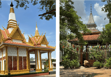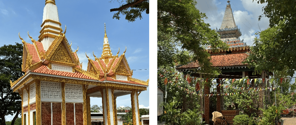 The new crematorium at Siem Reap’s Wat Svay, top left, is built of concrete with brick infill and concrete decorations highlighted in gold paint; an attached pavilion (mandapa) adds to the grandeur. Within a few months, the tip of the crematorium’s central spire was blackened by smoke from constant use.