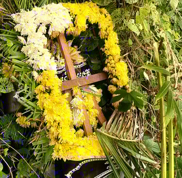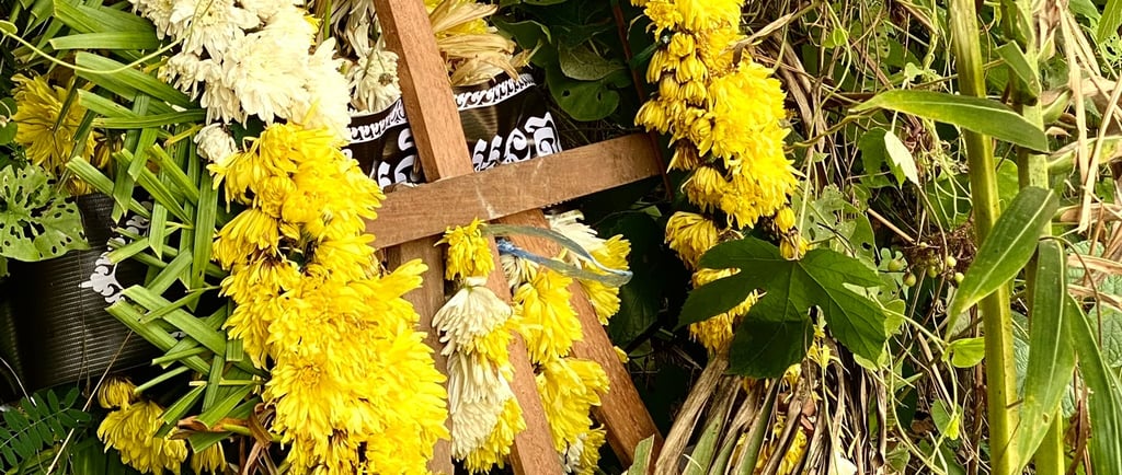 This rectangle of chrysanthemums decorates an empty frame that held a photograph of a person recently cremated at Wat Athvea in Siem Reap. Now discarded along with other floral trappings, the wreath lies in the scrub close to the towering crematorium. The grounds of Wat Athvea contain two religious institutions: the currently operating Theravada Buddhist wat, which faces east, and the 850-year-old Angkorian temple, Prasat Wat Athvea. The older stone temple was built by the same king who constructed the splendid Angkor Wat. These ancient Hindu temples are dedicated to Vishnu and, consequently, in contrast to the Buddhist wat, are oriented toward the west.