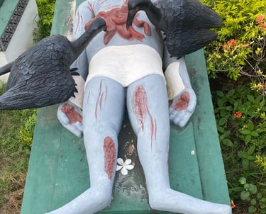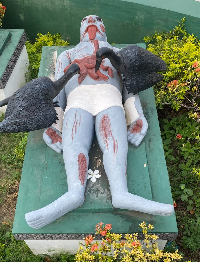 The wat commissioned sculptor KUM Mororot from Preah Dak Village to recreate the event for visitors. Perhaps Mororot’s imagination was a tad vivid, as he imagined the body not being taken to a cremation but being left to rot and be devoured by vultures, a traditional Hindu burial practice. He created two black vultures ripping and tearing out the entrails of the prone cadaver with its tongue lolling out and its eyes bulging. While his bloodless pale blue skin is smeared with wounds, by natural luck a fallen frangipani repeats the metaphor that life will pass.